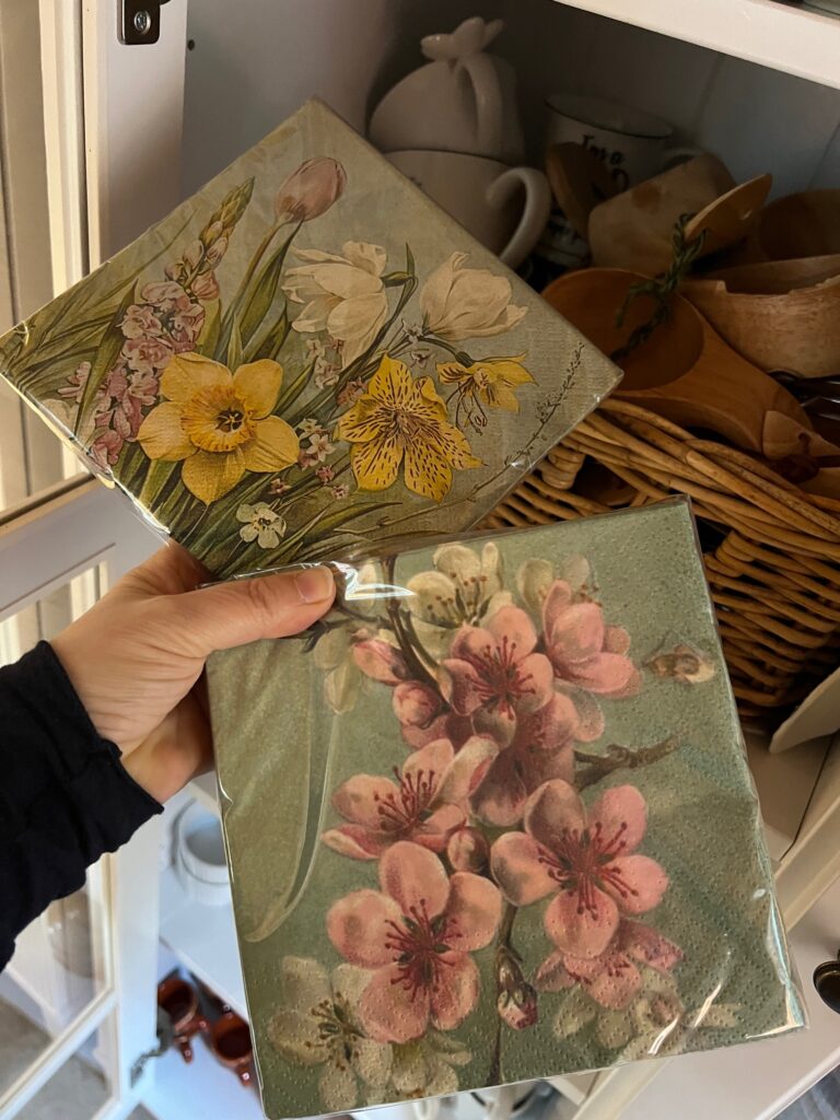 Köpte så fina servetter i keramikbutiken nära mitt jobb. Jag skulle vilja börja med keramik igen efter sommaren, har det som mål att hinna det. Vi får se om det fungerar. Jag vet inte hur hur mycket jag kommer jobba i klädbutiken framöver. Det beror lite på hur tjänsterna kommer se ut med sjukskrivningar osv Jag har ju er också. Tar det som kommer och är egentligen inte beroende av jobbet i klädaffären men tycker det är så kul och bra att bättra på pension. Älskar kombinationen.