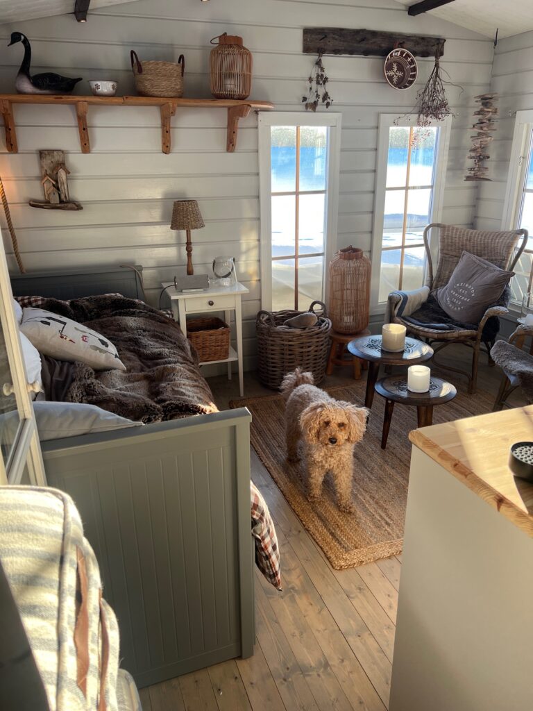 Att inreda en Sjöstuga har varit så roligt. Jag har ju alltid älskat hus vid vatten så det blir fåglar, båt, trä, korg och så blått och vit såklart. Vi har försökt att ta ner saker dit som vi redan hade hemma som tex vita skåpet från badrummet, korgstolarna som vi haft ett tag. Sängen/bäddsoffan är ny och så kom Elin med ett gammalt nattduksbord sedan förra huset. Trähyllorna fanns i stugan när vi flyttade hit.