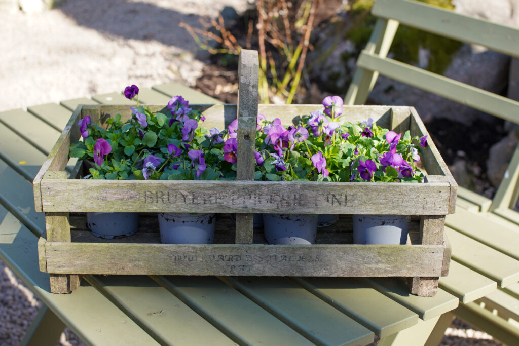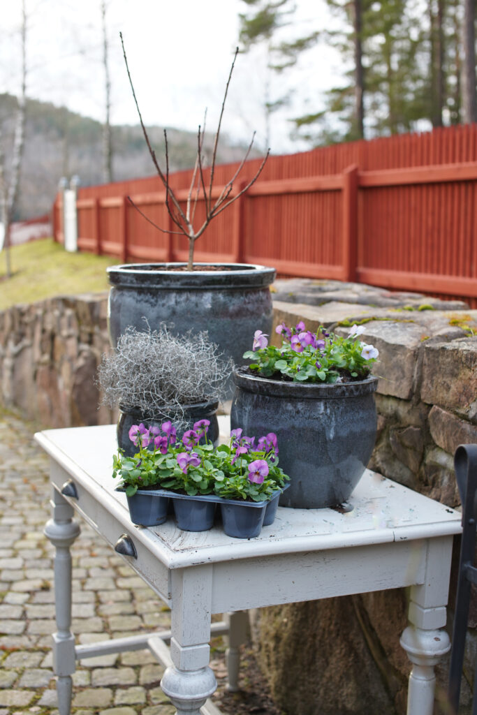 Jag planterade ut mina penséer som jag köpt på torget. Jag brukar plantera några stycken på våren för sedan vill jag fylla mina krukor med perenner och träd istället.