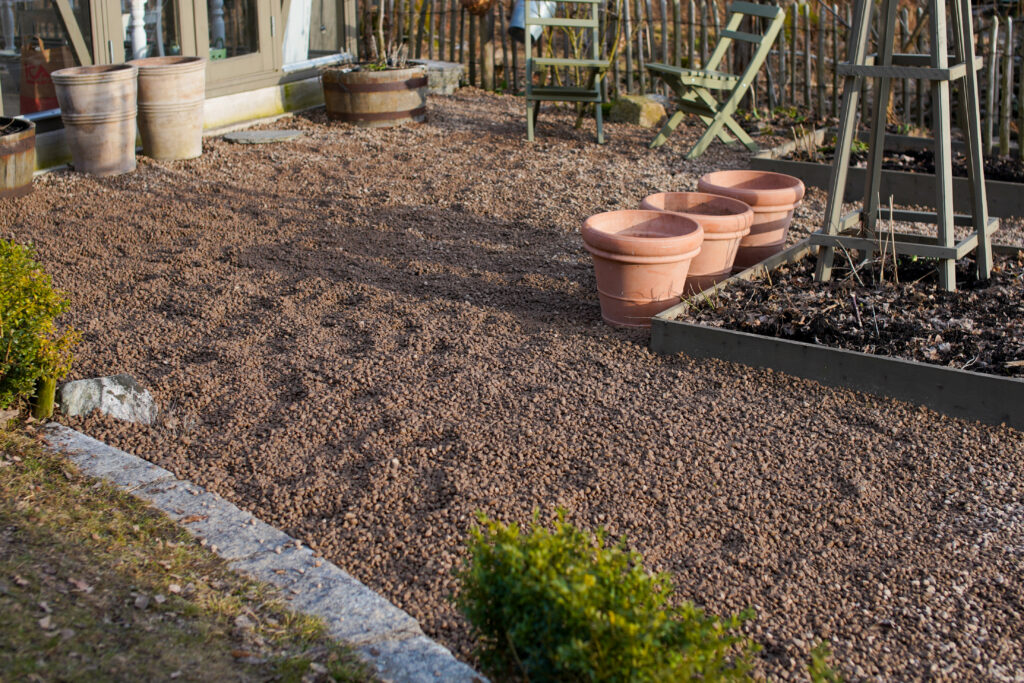 Vi hann köra ut gårdsgruset framför växthuset. Fick hjälp av Kalle och då går det mycket fortare. Nu är det skitigt så man ser inte den rätta färgen men det blir så mycket finare när det har regnat på det. Jag vet inte vilken storlek jag fick. När jag ringde så sa jag bara att jag ville köpa gårdsgrus med lite rött i så kom det här.