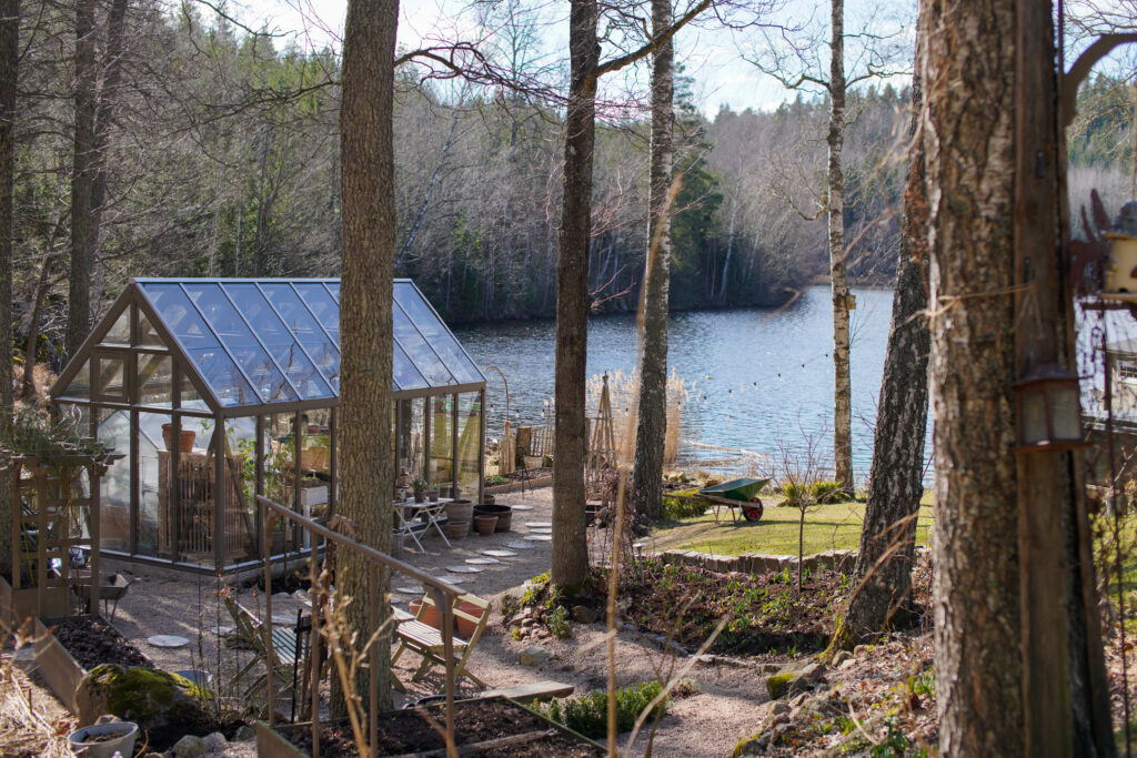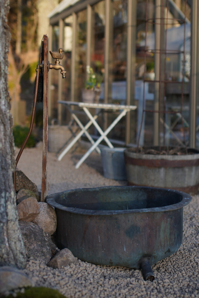På andra sidan av vattenutkastet ska jag sätta något som kan klättra upp på växthuset, kanske en ros eller en klematis, eller både och. Tänker mig som en båge där också mellan björken och växthuset.