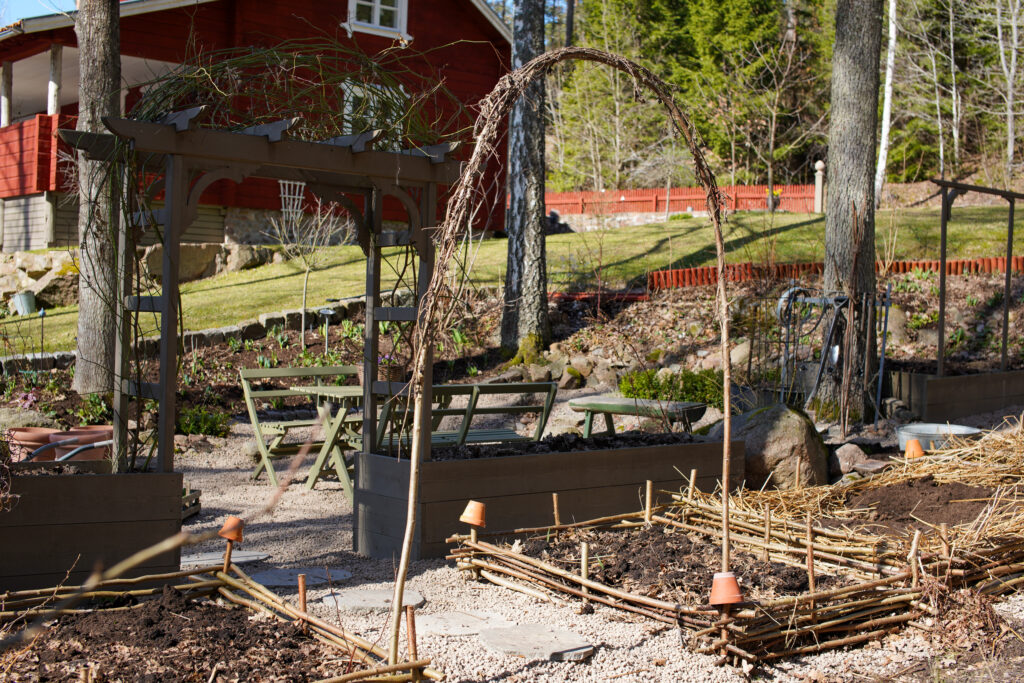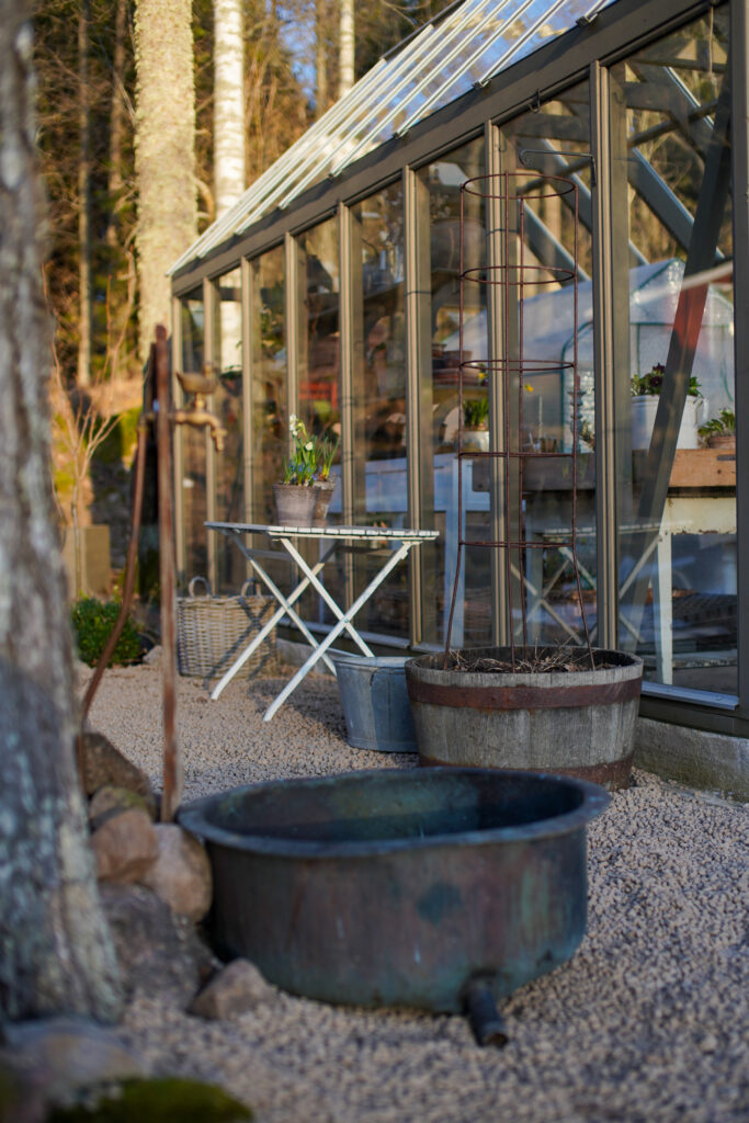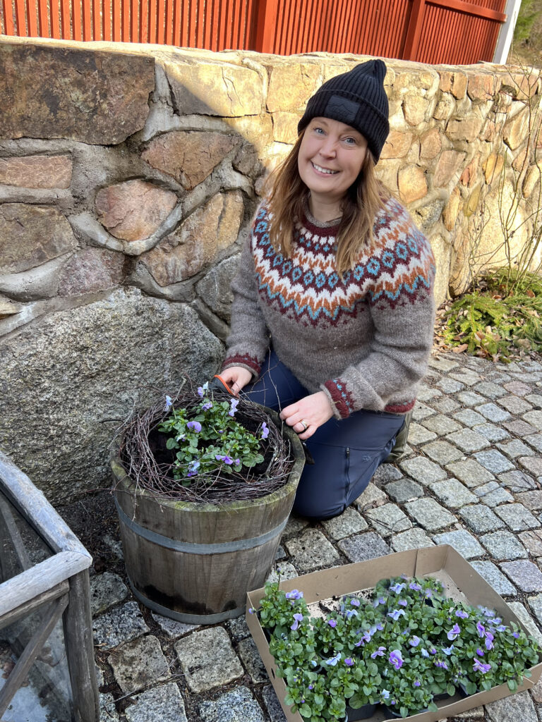 I de stora trätunnorna får träden stå kvar över vintern, det har fungerat bra men man måste kolla upp vilka träd som fungerar på vintern. Perennerna som jag sätter i krukorna, rosor osv de planterar jag sedan ut i rabatterna på hösten.