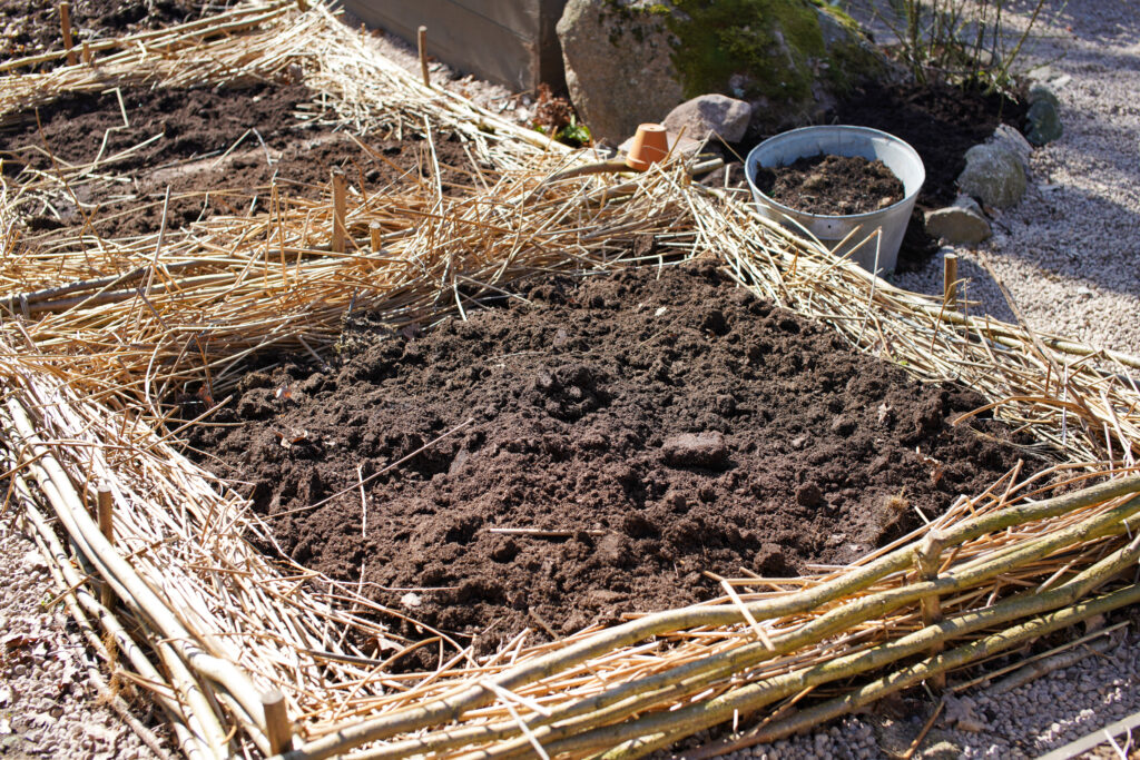 Massor av vass blåste rakt in på våran strand så den torkade jag och tog hand om, har lagt en del av dem runt mina odlingslådor. Jag har flätat mina odlingslådor med hassel, det kan jag rekommendera att göra tidigt på våren innan allt det gröna slår ut.