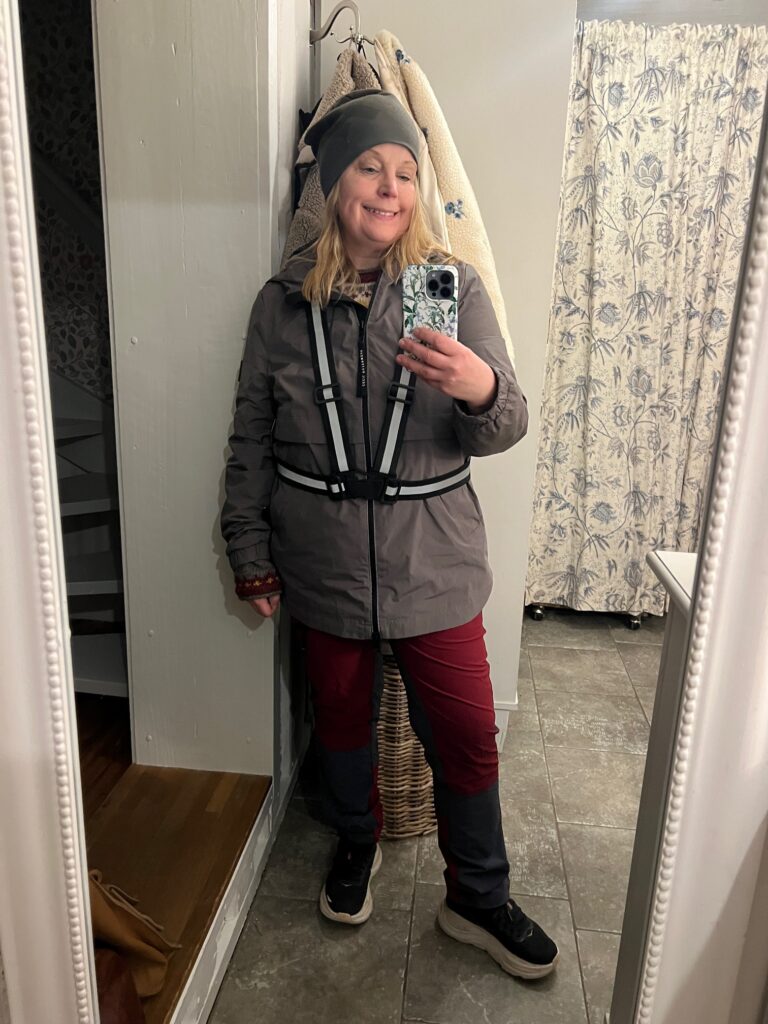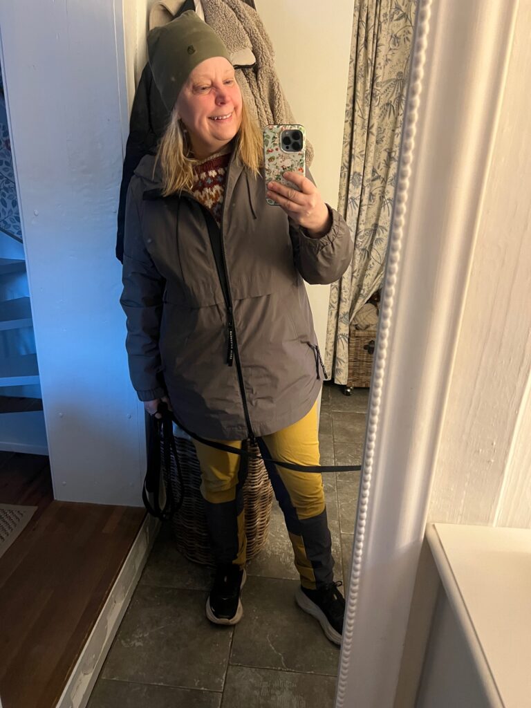 Att gå i fritidskläder och våra stickade tröjor är så skönt. Tänk när jag var sjuk och blev inlagd på sjukhus, då var min man så klok att han tog med den här tröjan in. Den är så mycket stugan för mig och min promenader med hund och katt.