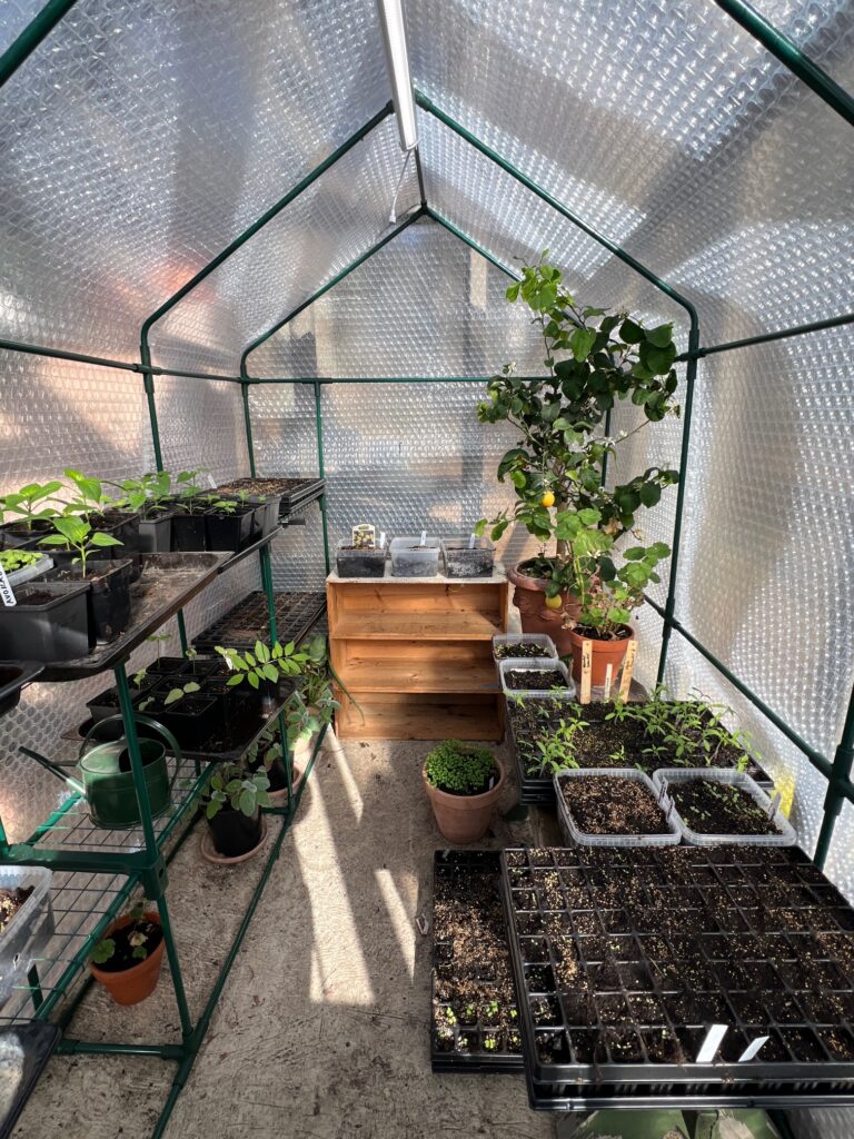 I plastväxthuset har jag lampa i taket som lyser och så en byggfläkt. Här inne är det ca 20-25 grader. Varma dagar öppnar jag upp på dagen och så låter jag en del av värmen sipra ut även i växthuset.