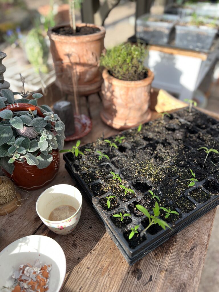 I växthuset blir det riktigt varmt när solen skiner in. Det blev omskolning av tomater, chili, paprika, klockranka mm