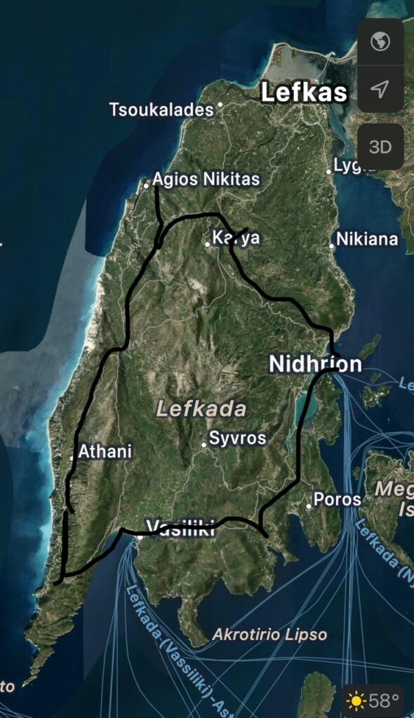 En av dagarna hyrde vi bil på Lefkas för att se oss omkring. Det brukar vara jag som kör bil för Kalle gillar inte köra bil och jag tycker det är kul. Vi hyrde bilen på Avis i Nidri. Här nedan är en liten karta på ungefär hur vi åkte.