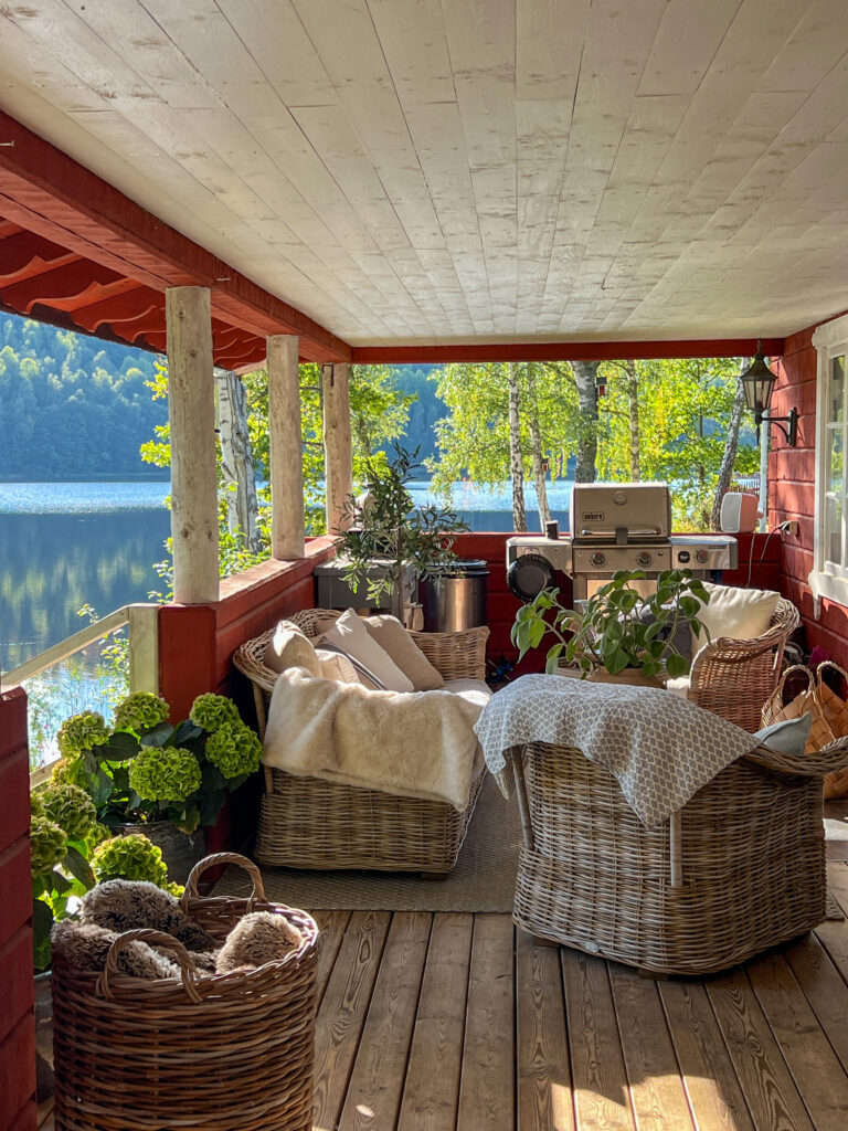 När man inte kan vara inomhus lika mycket och bara vill ut så är det fint att tänka att detta är mitt vardagsrum. Jag är mer här ute en inne i vardagsrummet. När jag var som sjukast satt jag här ute med en mössa på huvud. Kalle brukade elda då i kaminen på verandan. Jag hade så extremt mycket otäcka symptom och som gjorde att mitt huvud bara skrek, mina ögon sved och min hjärna fungerade inte alls.