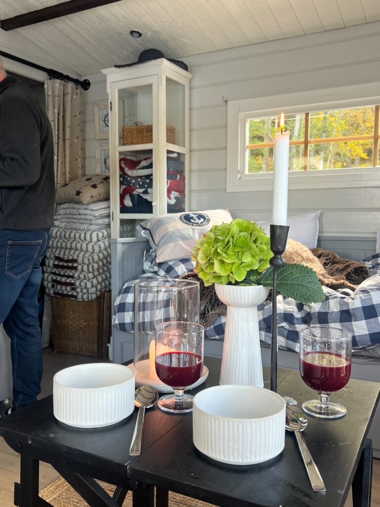 Vi startade vår söndag med frukost i Sjöstugan efter Pettson och jag gått i hagen på morgonen. Gröt med äpple och kanel och ett glas Proviva blev det idag.
