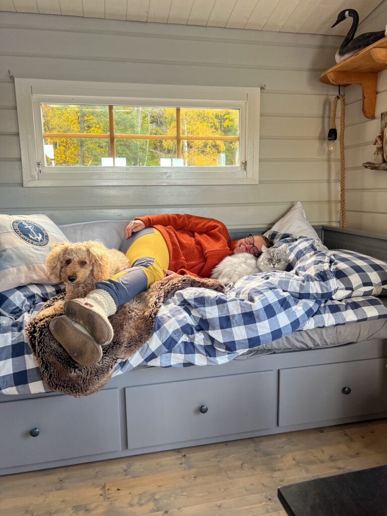 I eftermiddag har jag mediterat, jag ligger ner med ögonbindel och lyssnar på meditation i Bookbeat eller Spotify. Så skönt. Kalle har med börjat lyssna på ljudböcker. Han ligger där nere i soffan nu och lyssnar.