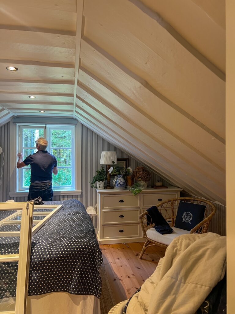 Sedan satte vi fart med att putsa alla fönster och att sätta i innanfönstren. När man hjälps åt går det fort. Jag putsar först sedan går Kalle efter och putsar det sista och sätter fast innanfönstren.