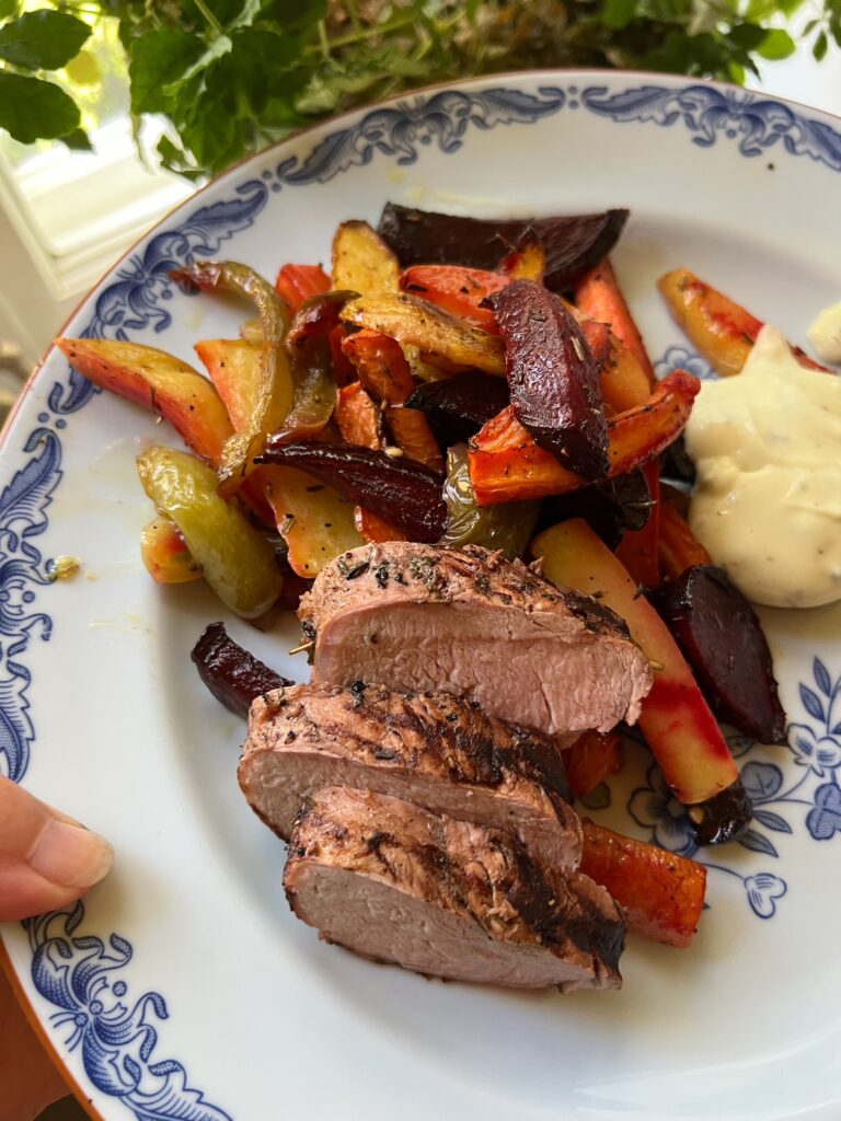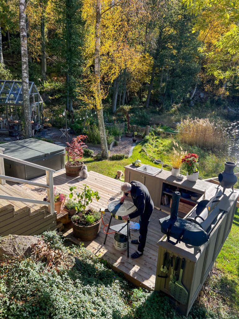 När Kalle är klar med fönstren så sätter han igång och lagar mat. Grillar fläskfilé med grönsaker i ugn och jag tar bort bevattningssystemet för vintern, fixar i odlingslådor osv